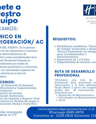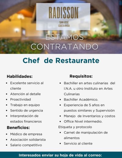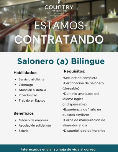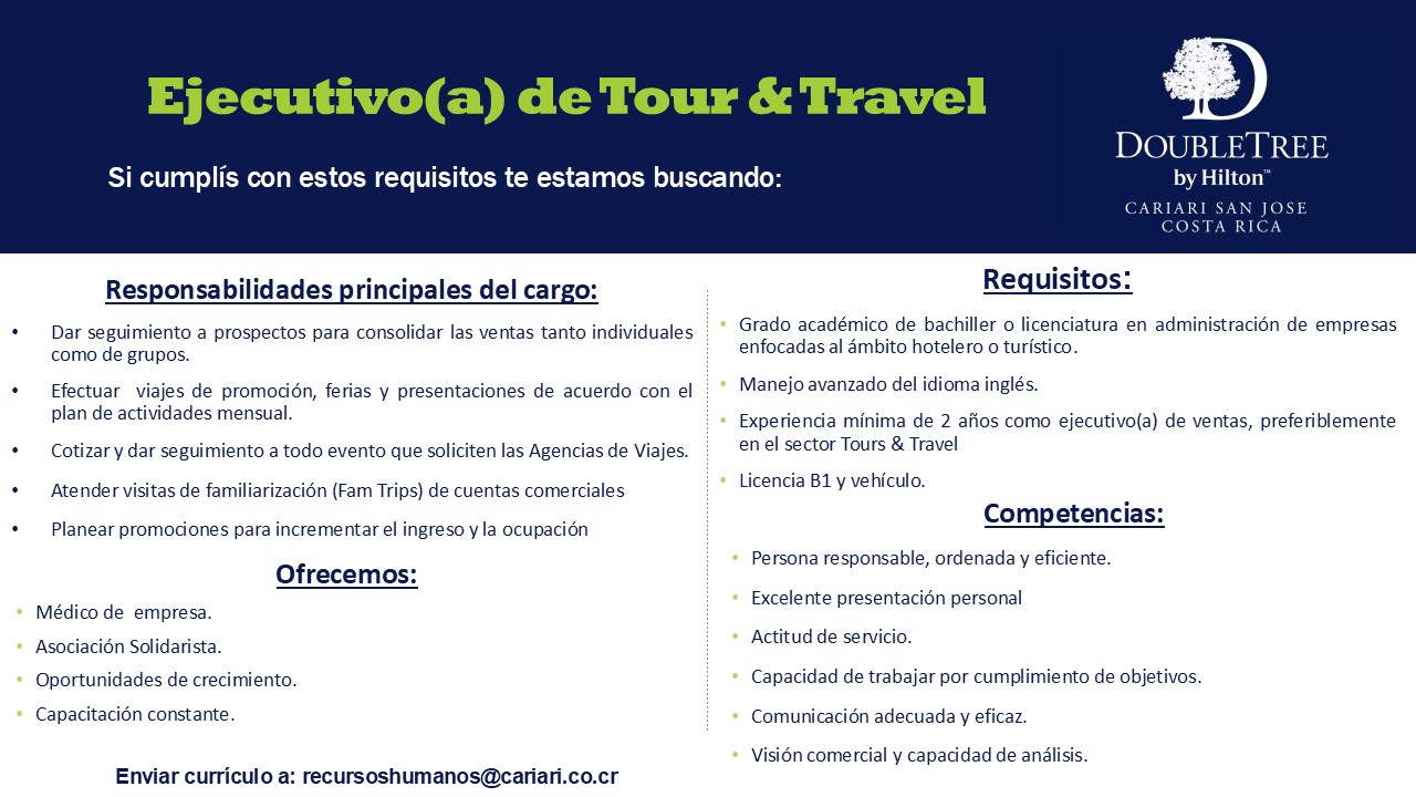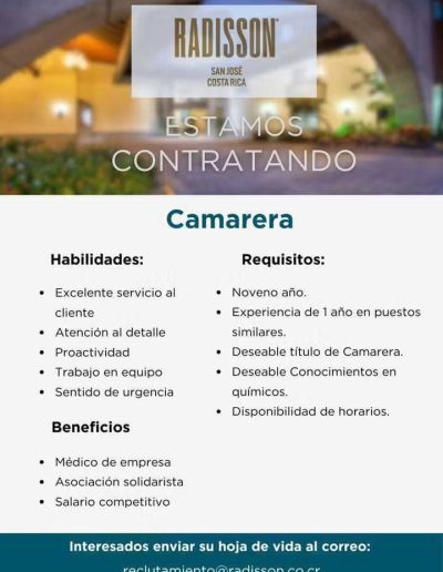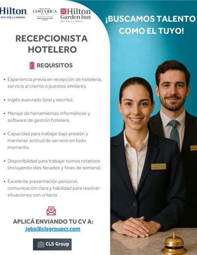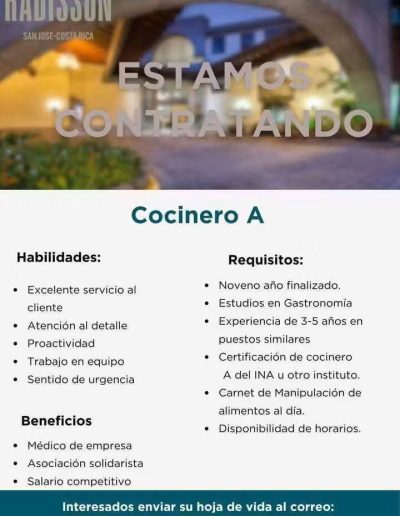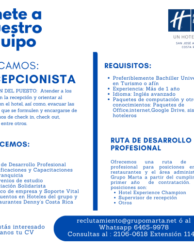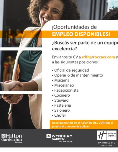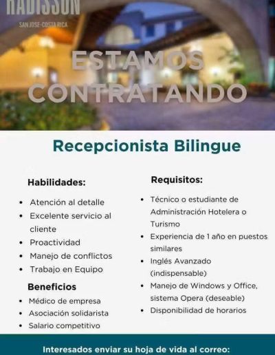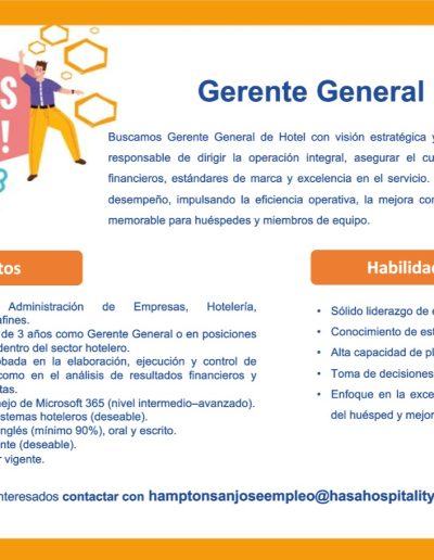 Vacantes de empleo en Hoteles Afiliados Información en cada imagen: ¡Reciba ofertas de empleo del sector hotelero y turístico de primera mano! Suscríbase a nuestra lista y le enviaremos las ofertas de empleo que tienen nuestros hoteles afiliados. Suscribase aquí